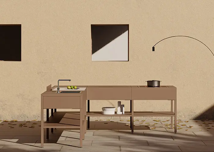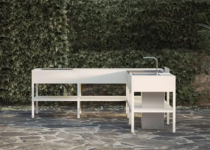 Le cucine sono disponibili in acciaio zincato o acciaio inox 316 verniciato con colori e nuance a scelta. Ogni modulo ha punti di giunzione standardizzati, questo permette di avere configurazioni personalizzabili anche in seguito all’acquisto, per poter tradurre la cucina nell’oggetto più rappresentativo del nostro abitare