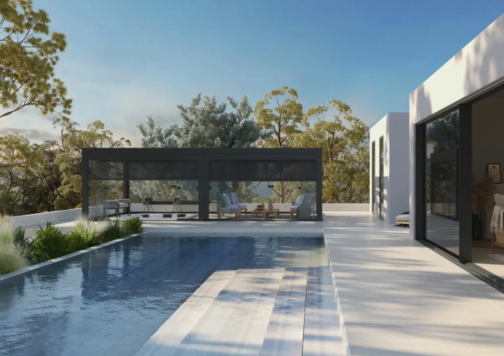 Sunlight può essere integrata con molteplici tipologie di chiusure, vetrate scorrevoli Line Glass a 3 vie o con il sistema di tende a caduta verticali Vertika Sunlight.