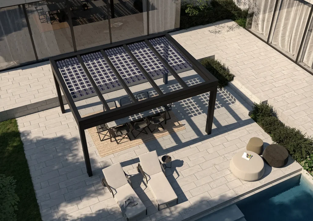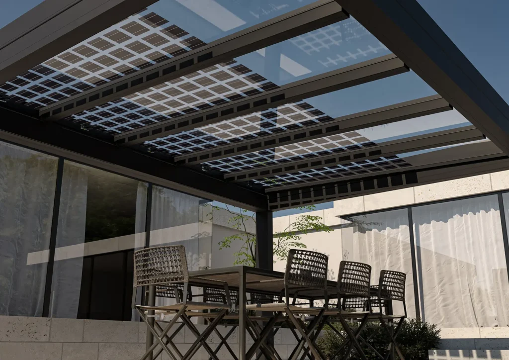 Sunlight, grazie alla sua versatilità, offre una soluzione innovativa per la produzione di energia sostenibile integrando nel tetto vetri fotovoltaici stratificati. Le celle fotovoltaiche di Sunlight sono strategicamente disposte a griglia, sfruttando al massimo la superficie disponibile. In una configurazione di dimensioni 6×4,5 metri, Sunlight è in grado di generare una potenza notevole di 1,4 kW. Questo rende il sistema adatto ad una vasta gamma di applicazioni, dal residenziale al commerciale. La possibilità di complemento con i nostri sistemi ombreggianti sopra e sottotetto e perimetrali contribuisce inoltre al comfort termico e al benessere abitativo complessivo.