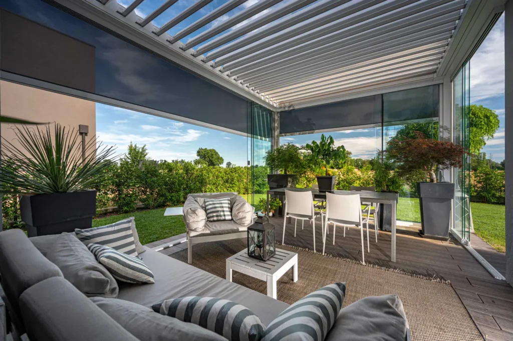 Struttura in alluminio e tetto a lame orientabili fino a fino a 135°