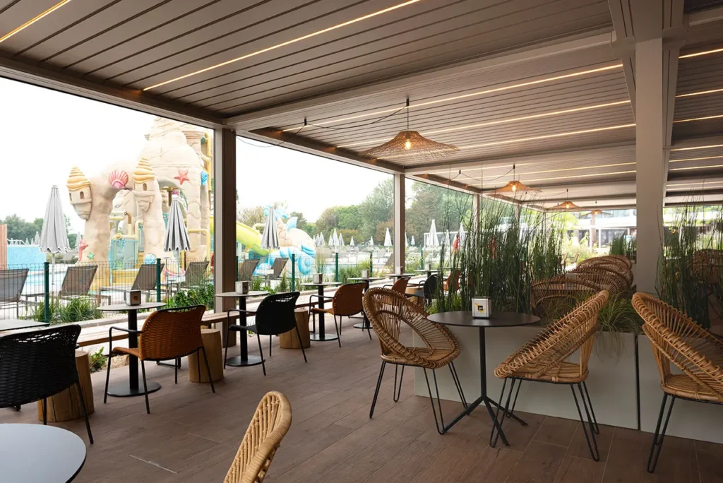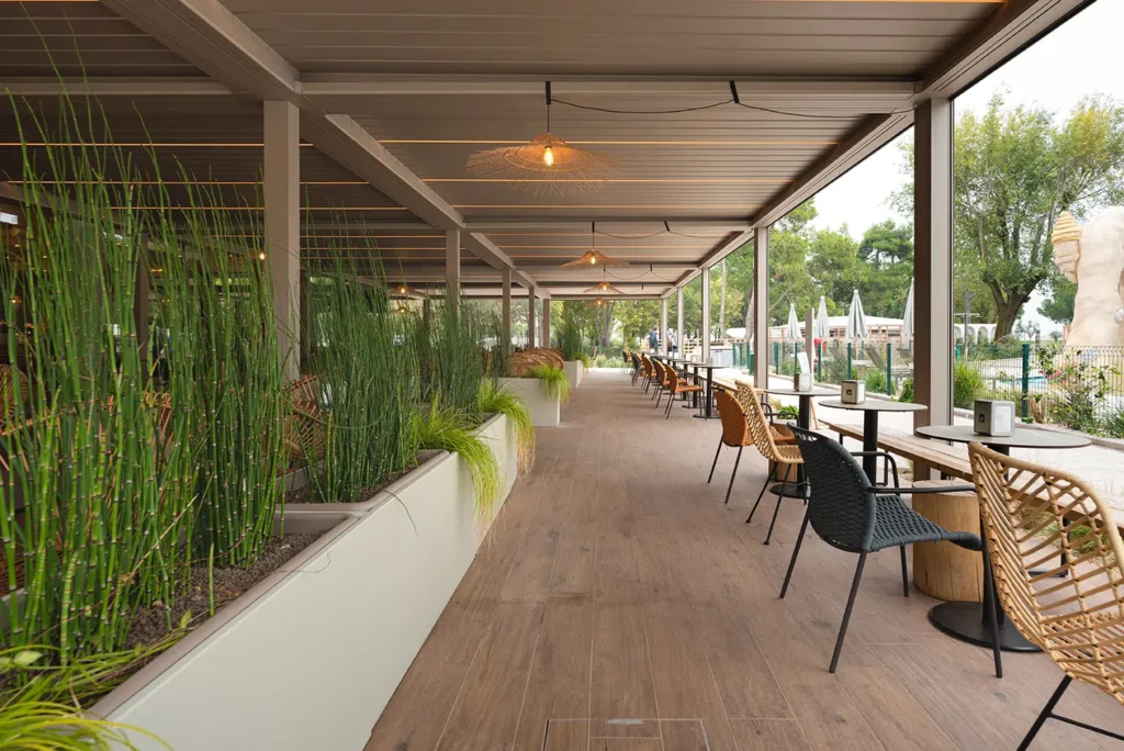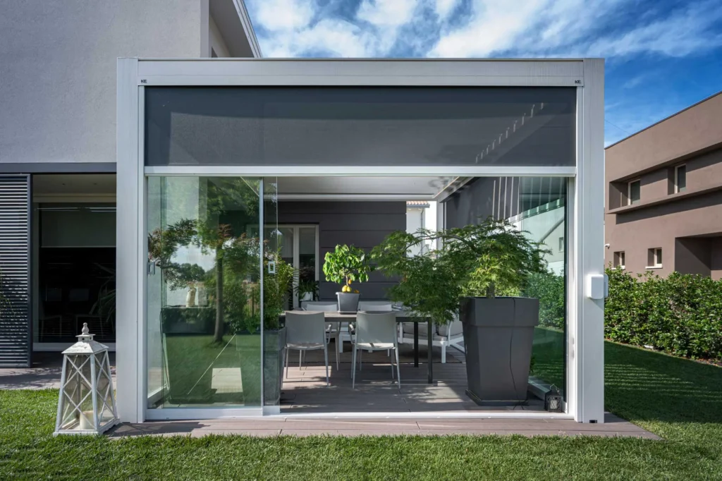 Possibilità di chiusura con tende tecniche verticali e sistemi di vetrate scorrevoli