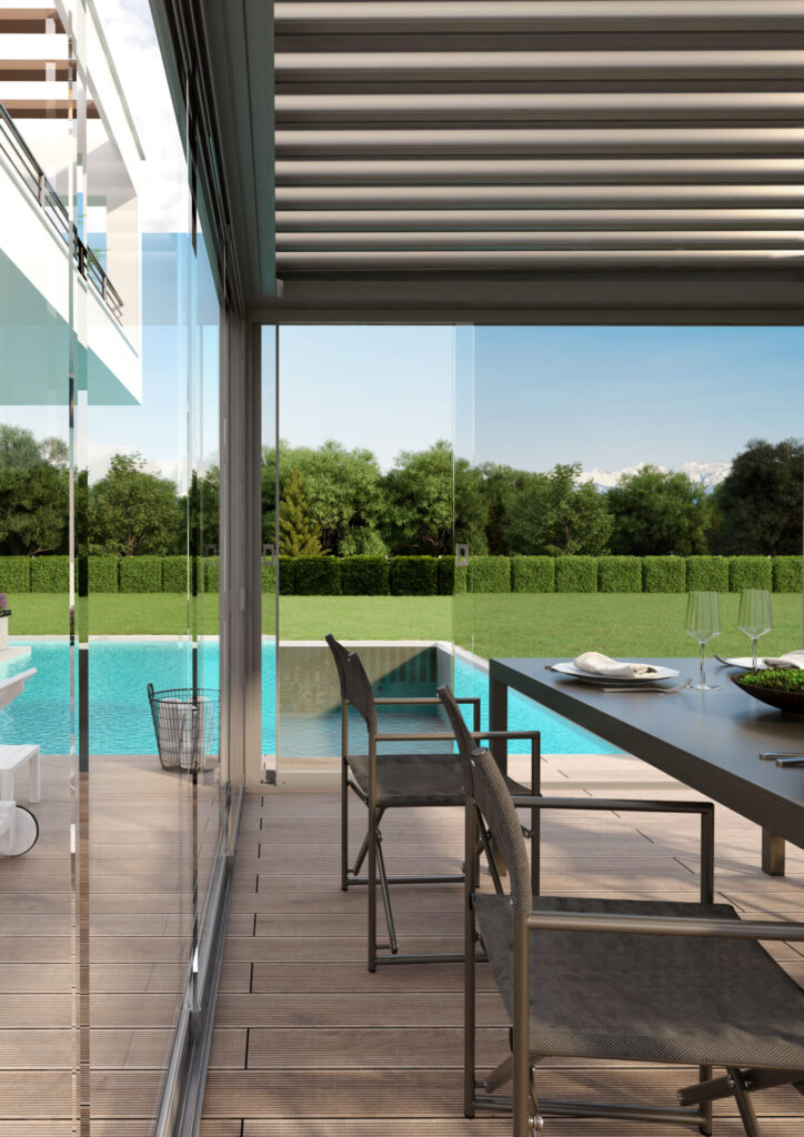 Soluzione ideale per vivere la propria pergola, al riparo da vento, pioggia e rumore, il sistema si caratterizza per il design lineare dimostrando la cura dei dettagli che da sempre caratterizza l’offerta KE.