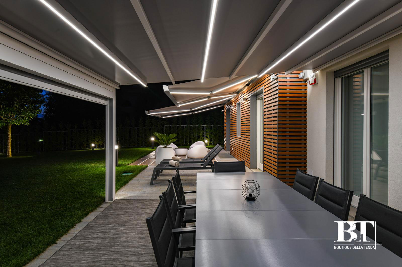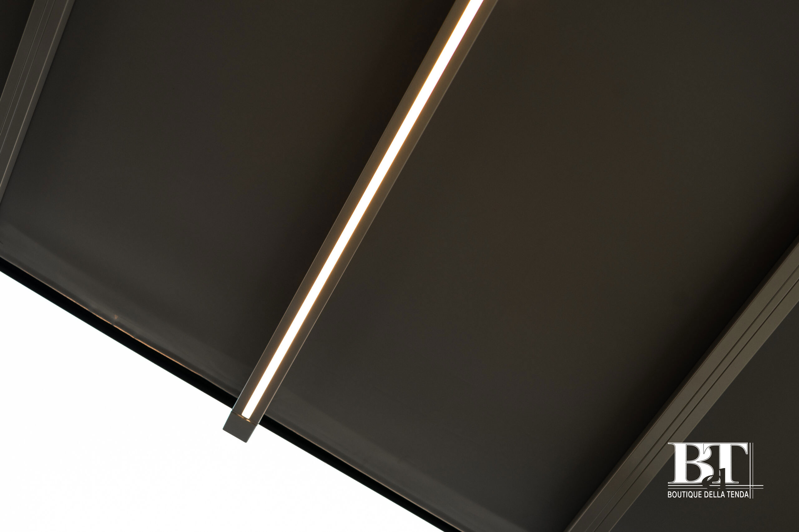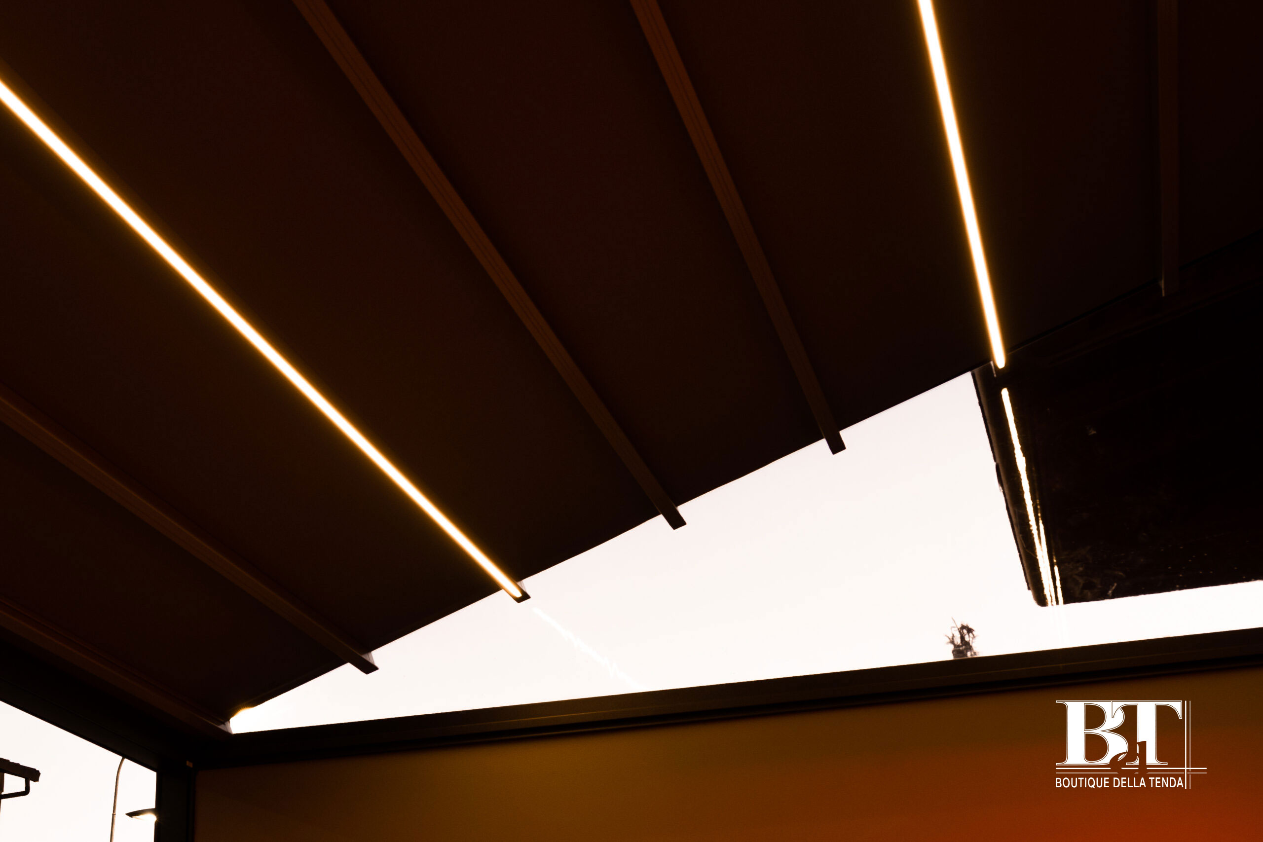 L’uso creativo della luce, elevata a vero e proprio elemento decorativo, rende questa struttura unica nel suo genere. L’illuminazione esterna ne esalta il design raffinato, mentre i punti luce interni conferiscono leggerezza alla struttura e ai profili in alluminio.