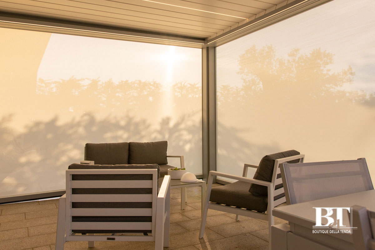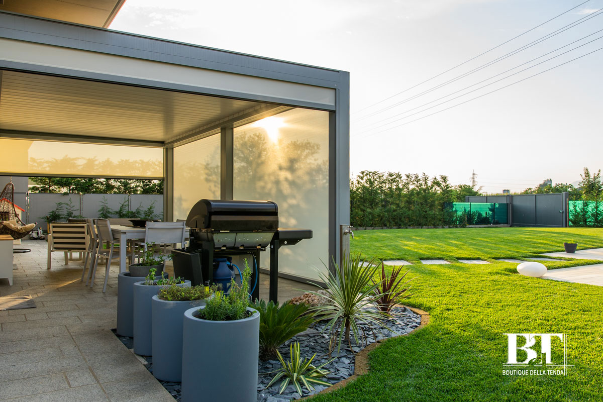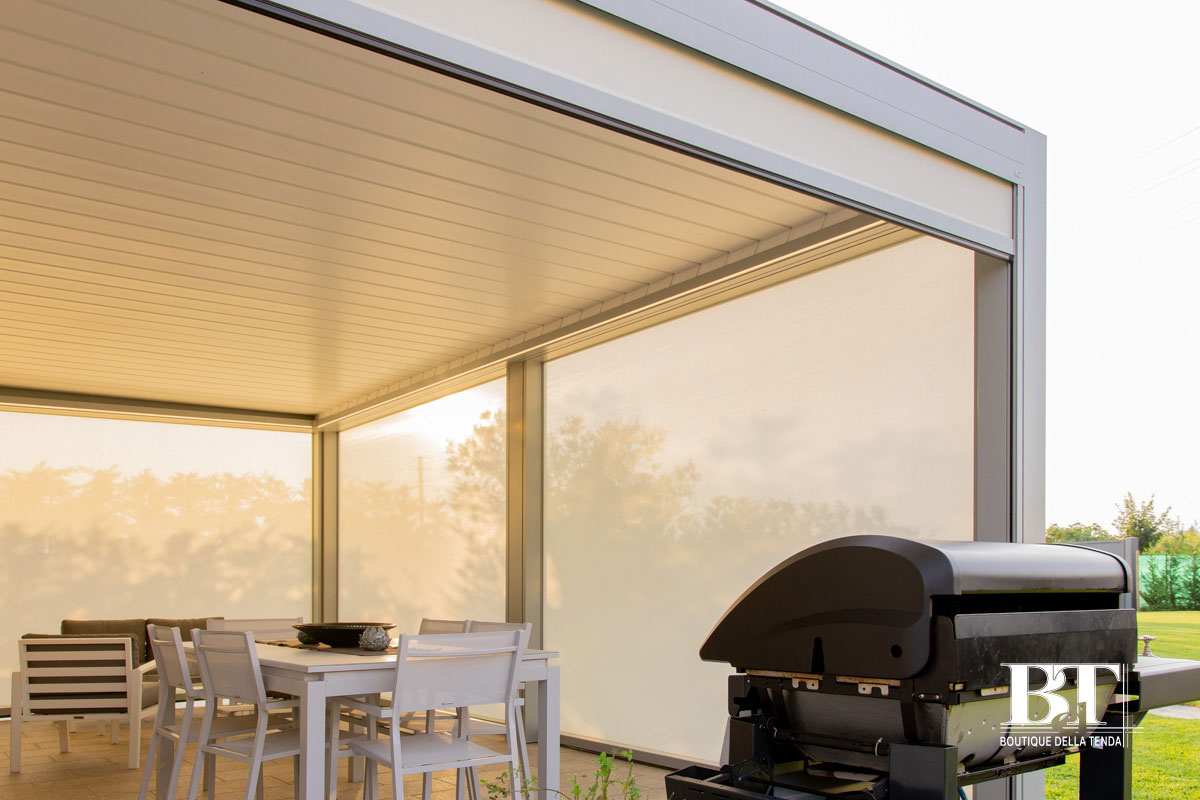 Gennius Vega è la pergola pensata per essere vissuta tutto l’anno, grazie anche alla tenda frontale a caduta Vertika, che assicura protezione e comfort anche in caso di maltempo.